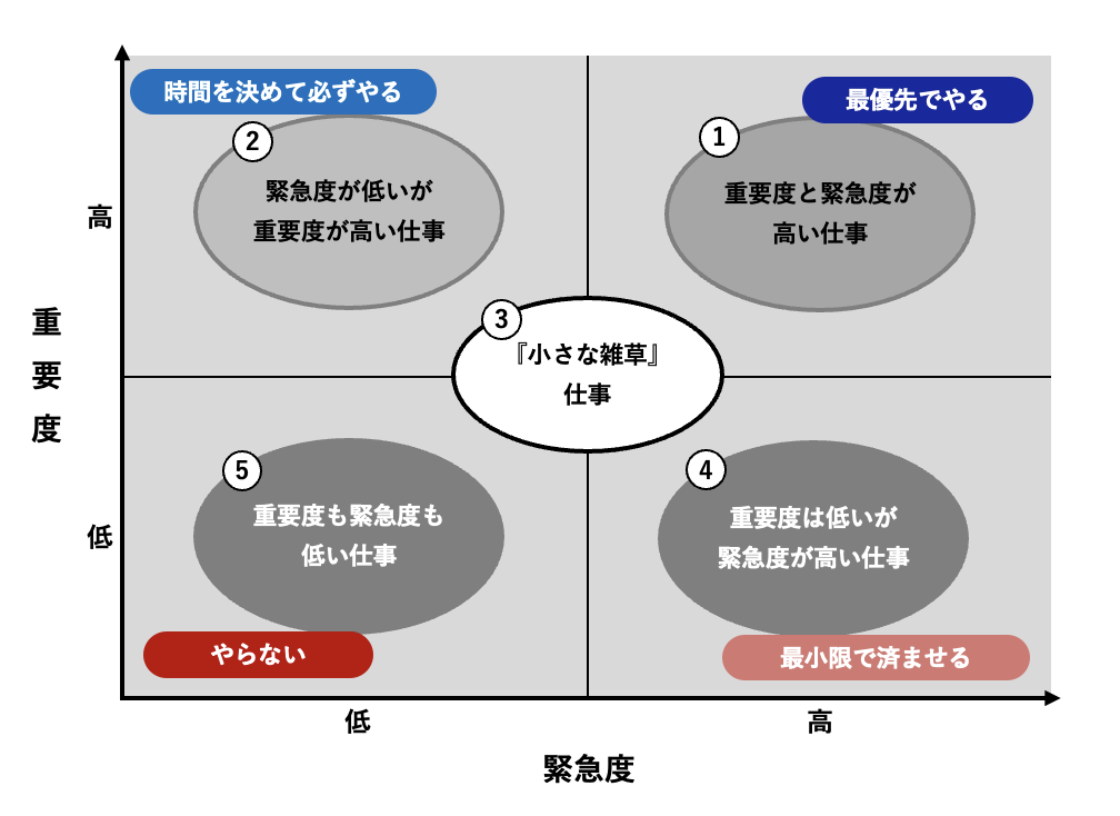 ⑤やらない仕事(重要でも緊急でもない):ムダな仕事。意識的に“やらない”選択をする。